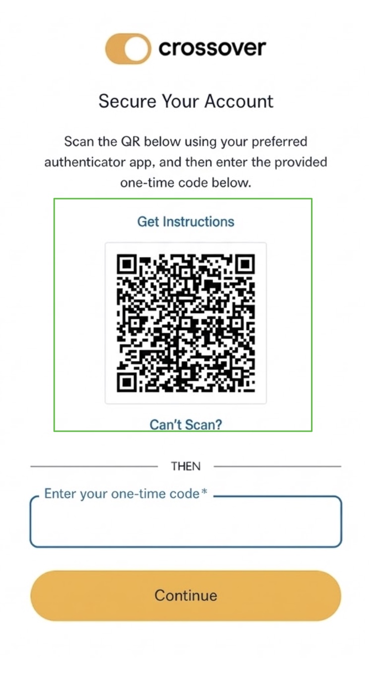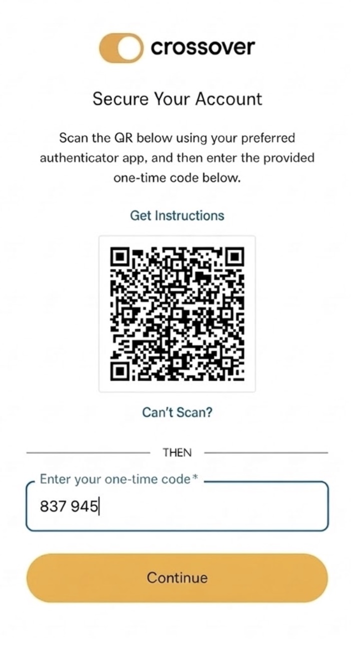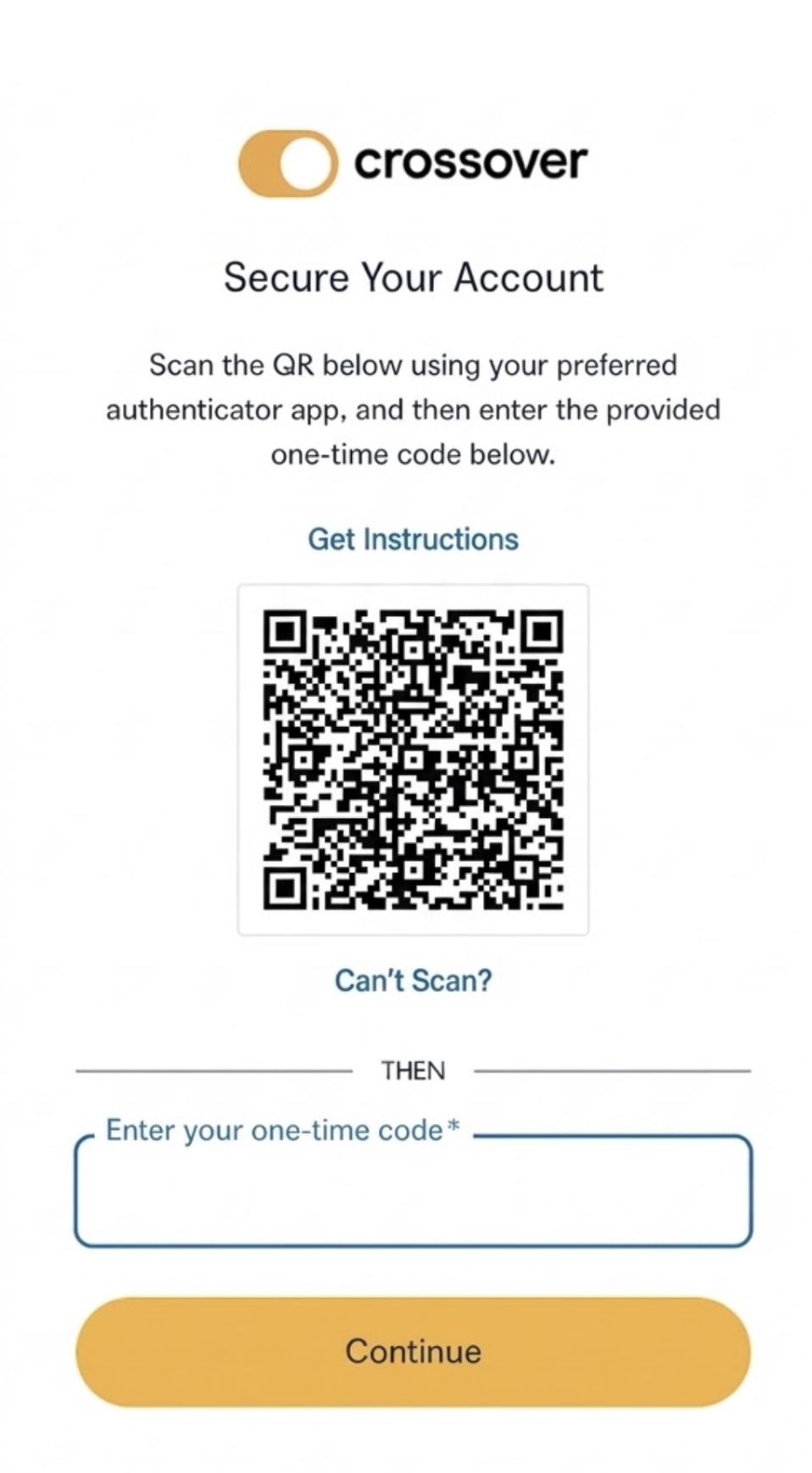 - Return to the Crossover log in page and enter the one-time six-digit code currently displayed in the Google Authenticator app to verify the setup