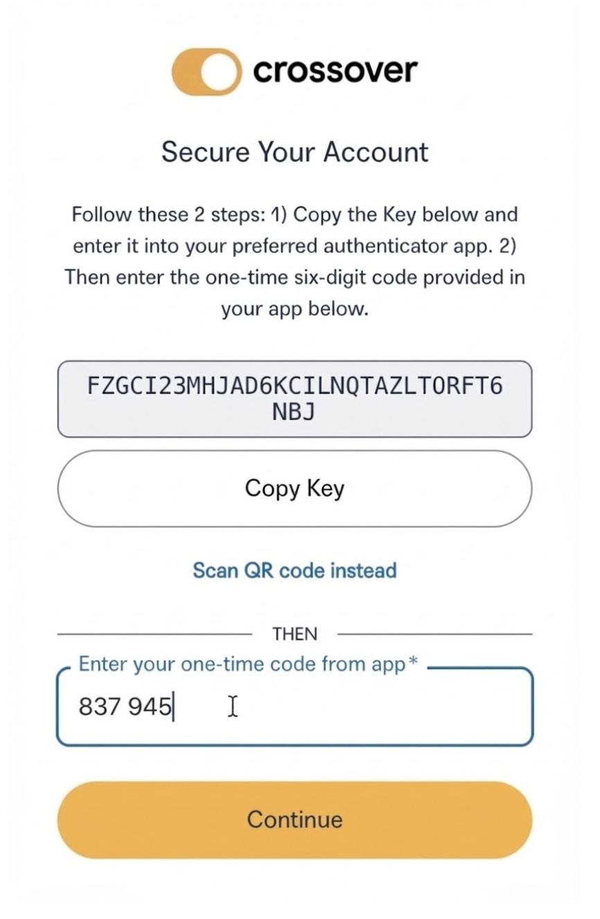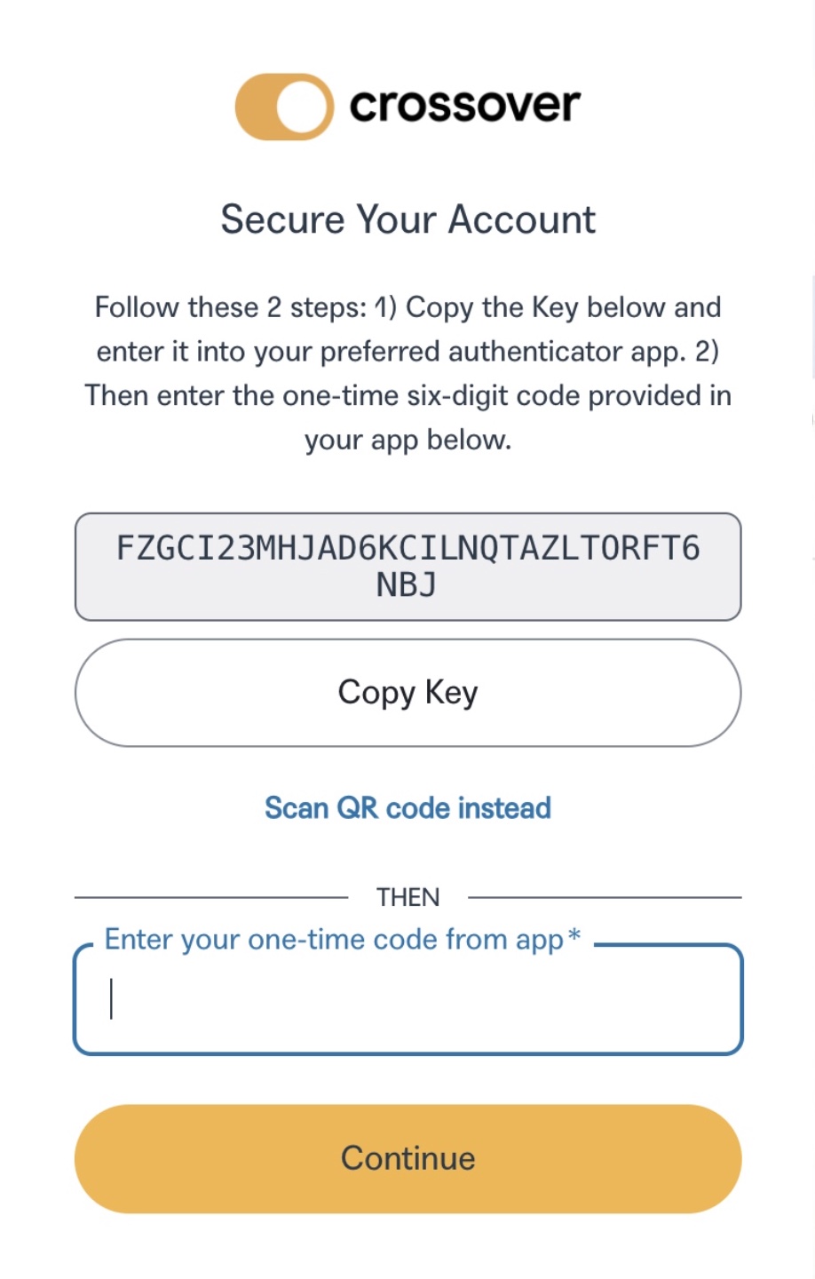Note: When you log in to your Crossover account going forward, you will be asked to input a one-time six-digit code from Microsoft Authenticator.