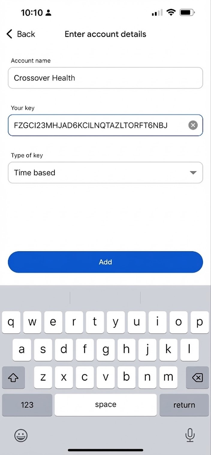 - Return to the Crossover Health app and enter the one-time six-digit code currently displayed in the Google Authenticator app to verify the set up